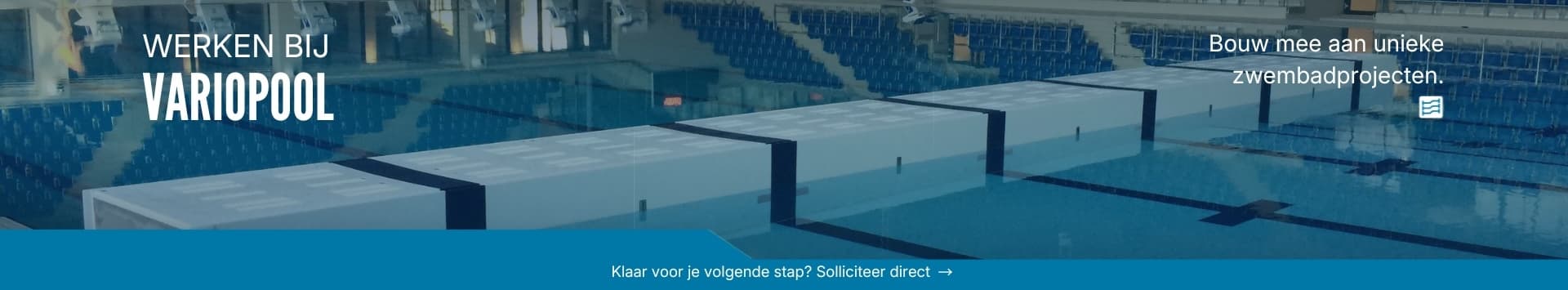 Werken bij een internationale topper? Duik erin! Ben jij klaar voor de mooiste baan ter wereld? Dan ben je hier aan het juiste adres! Bij ons vind je toffe vacatures binnen een dynamisch en internationaal bedrijf – en misschien ben jij straks wel onze nieuwe collega. Als marktleider in beweegbare zwembadbodems en keerwanden werken we al bijna 50 jaar met één doel: topkwaliteit leveren. Veiligheid, duurzaamheid en innovatie zitten in ons DNA. We zijn constant in beweging, net als het water in onze beweegbare zwembadbodems. Voor ons is een blije opdrachtgever net zo waardevol als een gouden plak. Dus… spring jij met ons in het diepe? We kijken uit naar jouw sollicitatie!